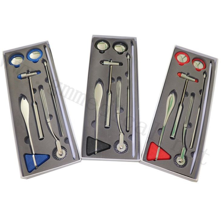 मल्टीफ़ंक्शनल पर्क्यूसर डायग्नोस्टिक रिफ्लेक्स पर्क्यूशन हैमर सेट मेडिकल न्यूरोलॉजिकल मसाज हैमर किट हेल्थ केयर रिफ्लेक्स हैमर सेट में 5 अलग-अलग रिफ्लेक्स हथौड़े होते हैं: ट्रायंगल हैमर, लॉन्ग मेटल रॉड हैमर, लॉन्ग प्लास्टिक रॉड हैमर, टी-शेप हैमर, गीर व्हील हैमर।